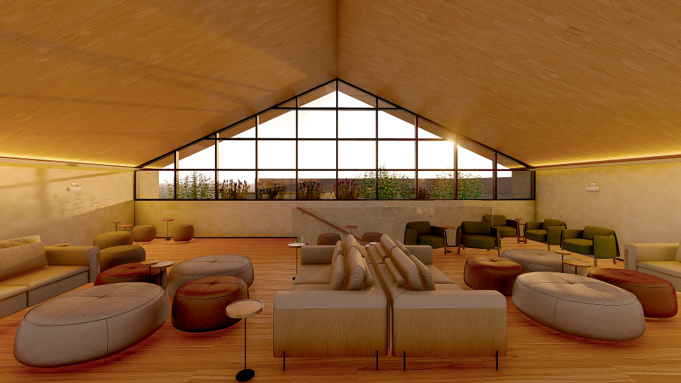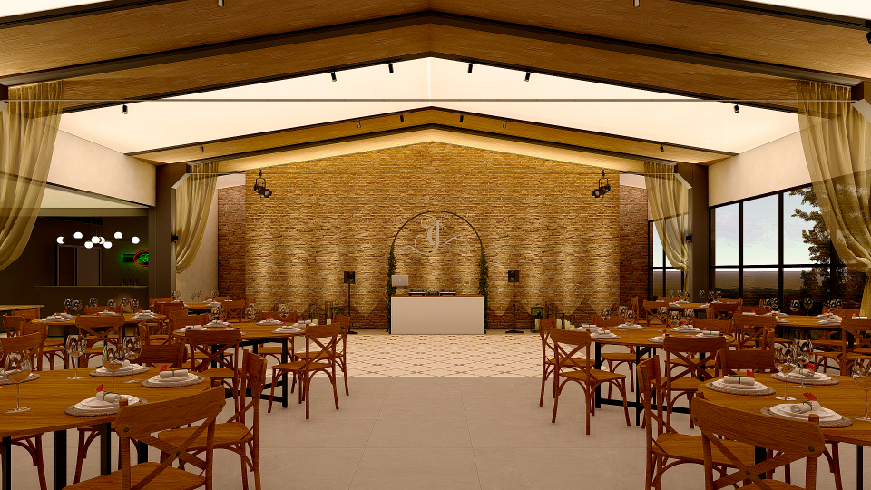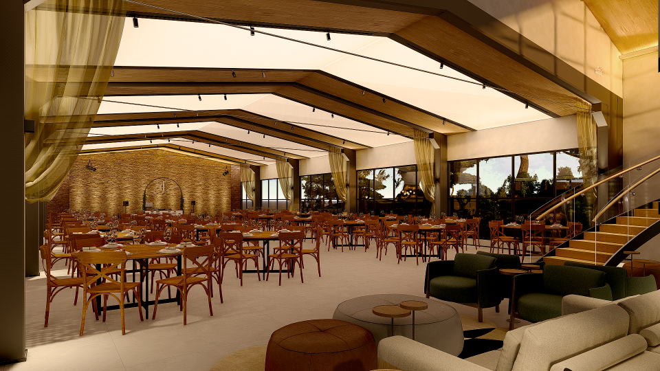 A grande transformação se deu, pela mudança do forro. Tornando um elemento de maior amplitude, acompanhando a inclinação do telhado existente, com iluminação por lona tensionada inspirada no caimento do véu da noiva.