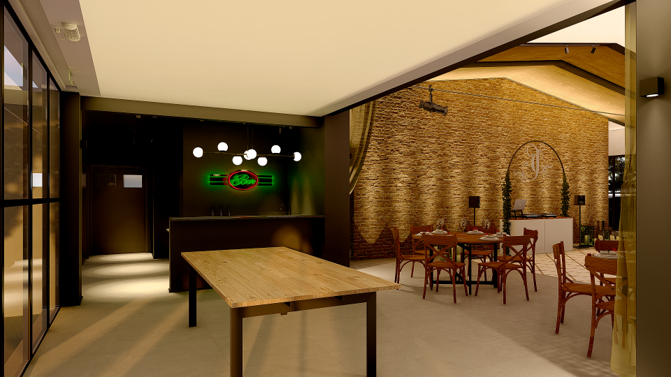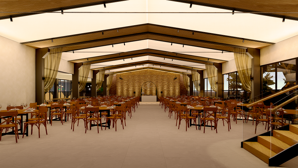 Em meio a um bairro de colonização italiana e de chácaras. Este salão de eventos com uma estrutura pré fabricada de concreto nos trouxe a demanda da criação de uma cobertura para desembarque e o desejo da criação de um mezanino com uma escada.