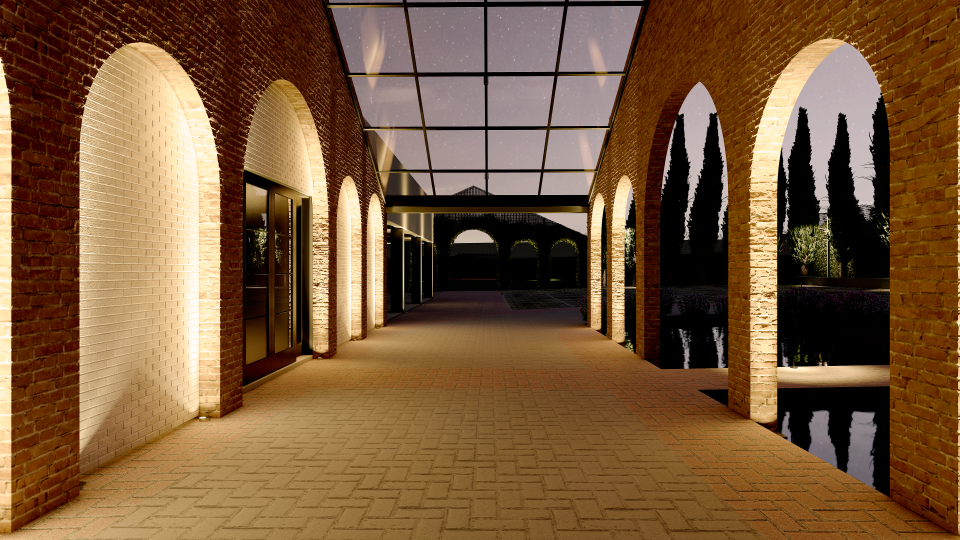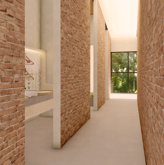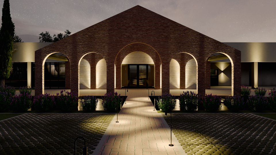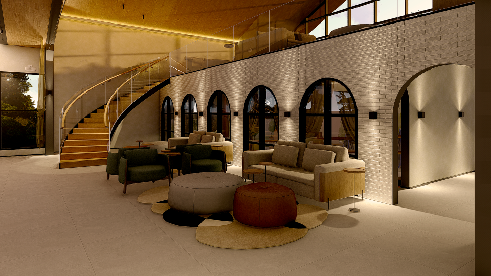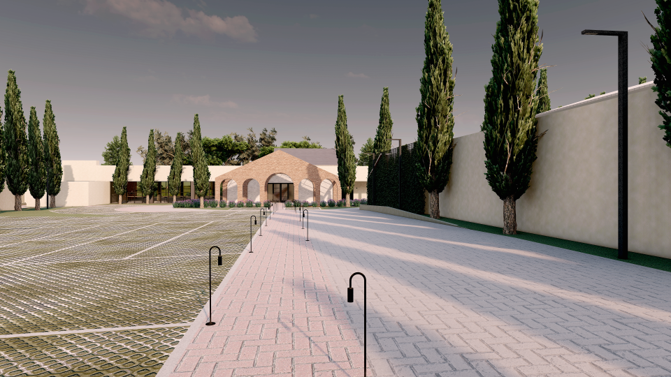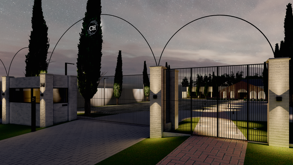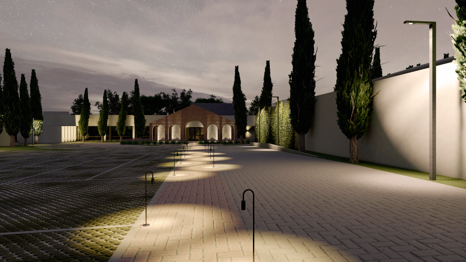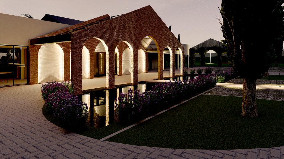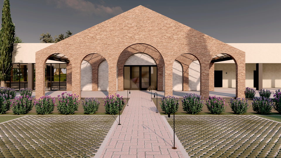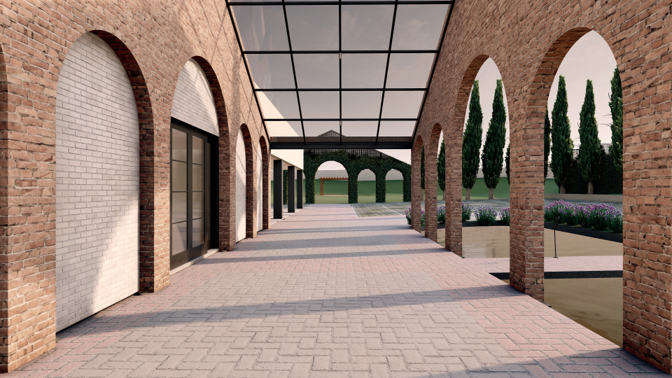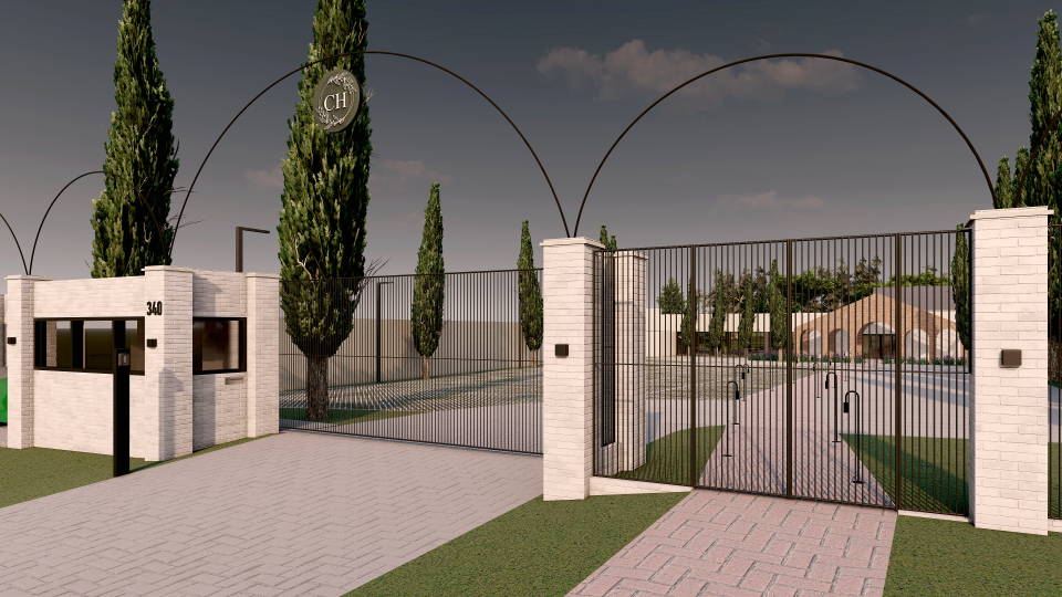 Assim então, foi criado um portal feito com tijolos de demolição, da chaminé da Antiga Olaria (desativada) da família, um item adicionado ao salão de eventos existente, que além de ser abrigo para o desembarque das estrelas dos eventos e convidados, também agregou cenário e a identidade do lugar.