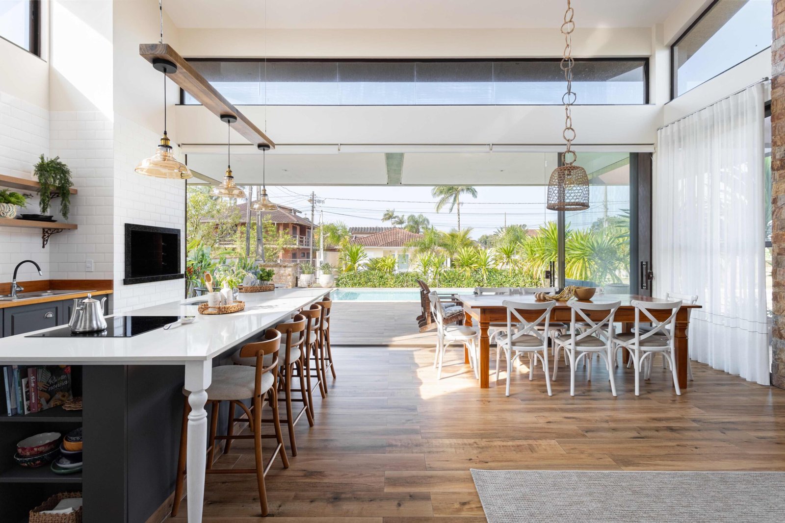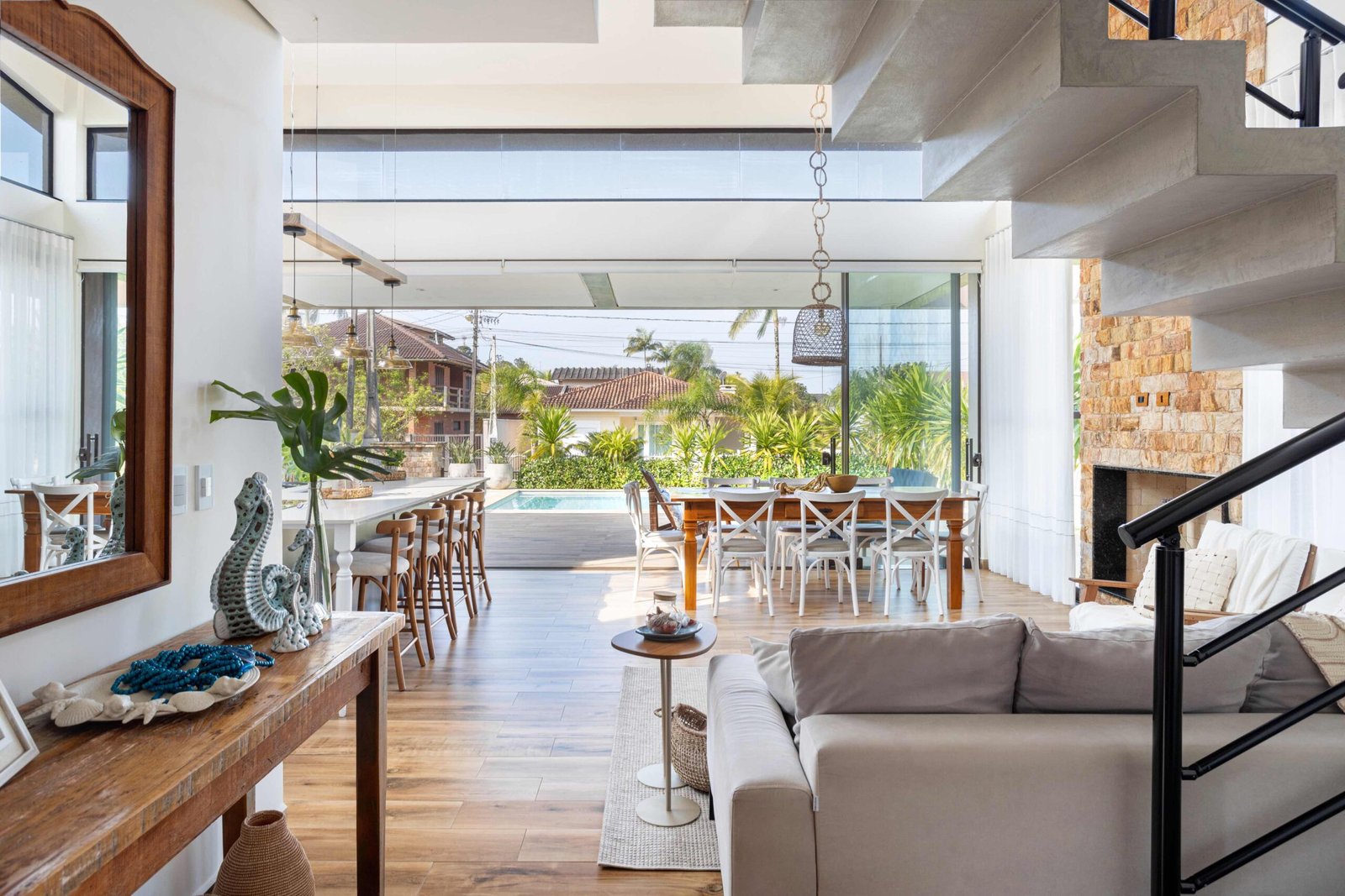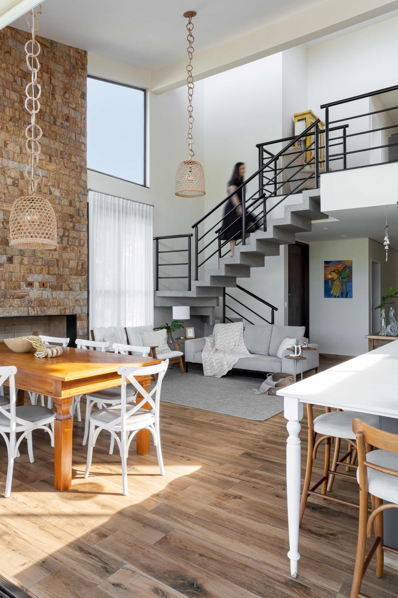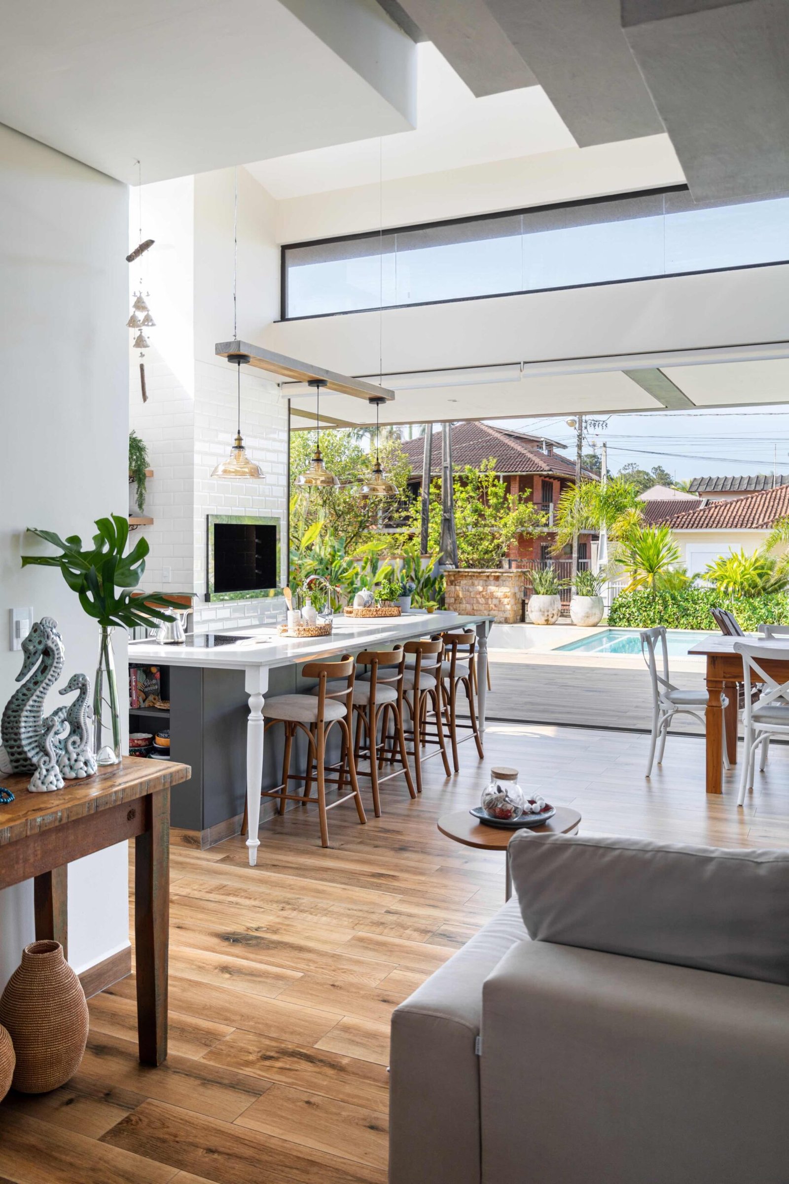 No Litoral do Paraná, projetamos uma casa de praia para um casal e seus três filhos, que desejavam um refúgio para momentos em família nos fins de semana e, no futuro, um lar para a aposentadoria. Com 226m² de área construída em um terreno de 450m², a casa foi pensada para ser fresca e confortável, aproveitando ao máximo as condições naturais do local. Elevada 1 metro do chão para evitar a umidade comum no litoral, a casa ganha privacidade e permite que a piscina, posicionada na esquina, receba a melhor insolação. A ventilação natural é abundante, com o telhado inclinado e o forro que favorecem a circulação de ar, expulsando o calor através da janela superior, criando um efeito chaminé. Com 6 quartos, sendo 2 suítes, a casa integra os ambientes de forma fluida, com grandes portas de vidro que conectam a varanda e o mezanino. O estilo, inspirado nas viagens da família e na Provence, traz elementos de pedra natural e um paisagismo encantador, criando um ambiente acolhedor e sofisticado sem exageros. A cozinha, um dos destaques, reflete a personalidade dos moradores, trazendo um toque marcante à decoração. A casa é, acima de tudo, um lugar para viver intensamente a convivência familiar, em harmonia com a natureza e com o clima local.