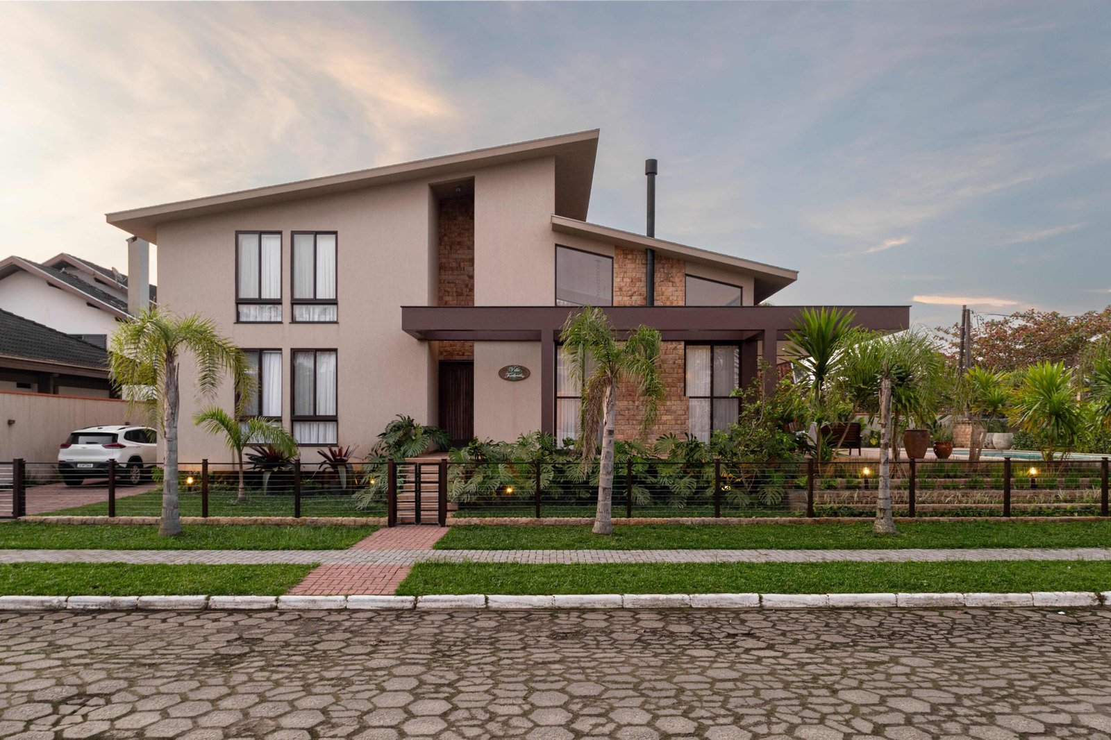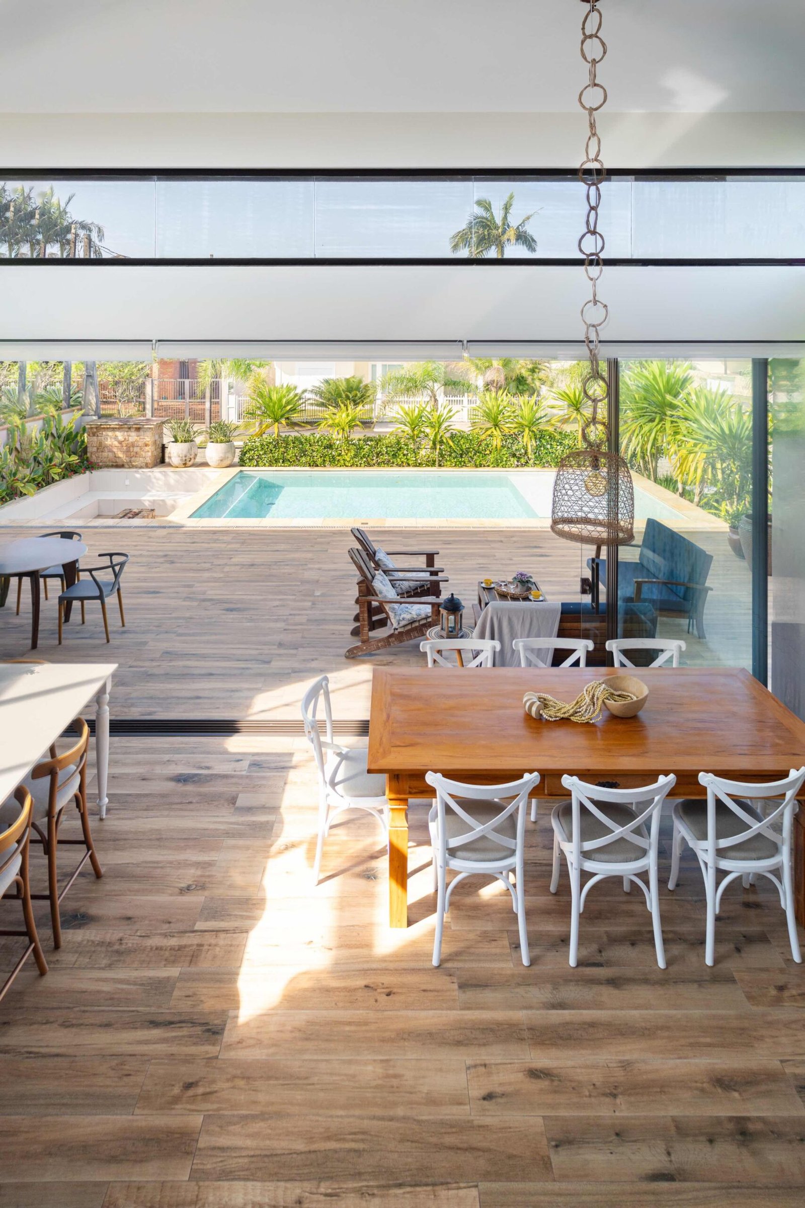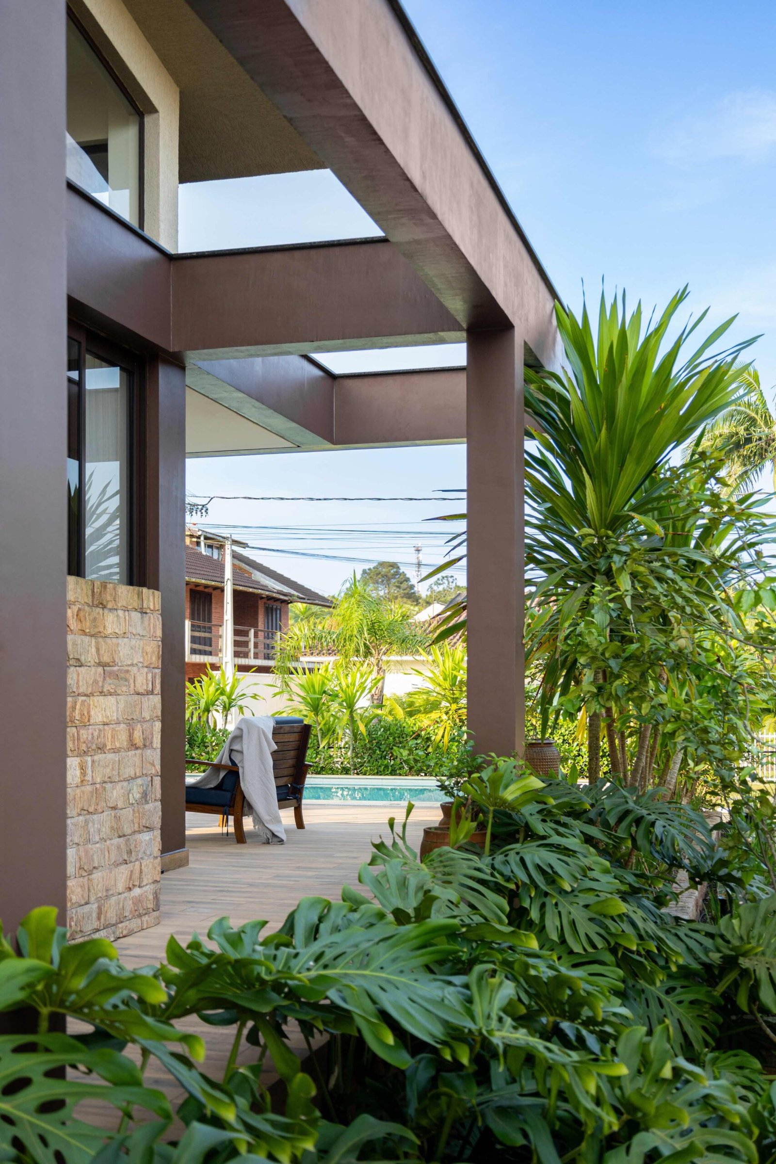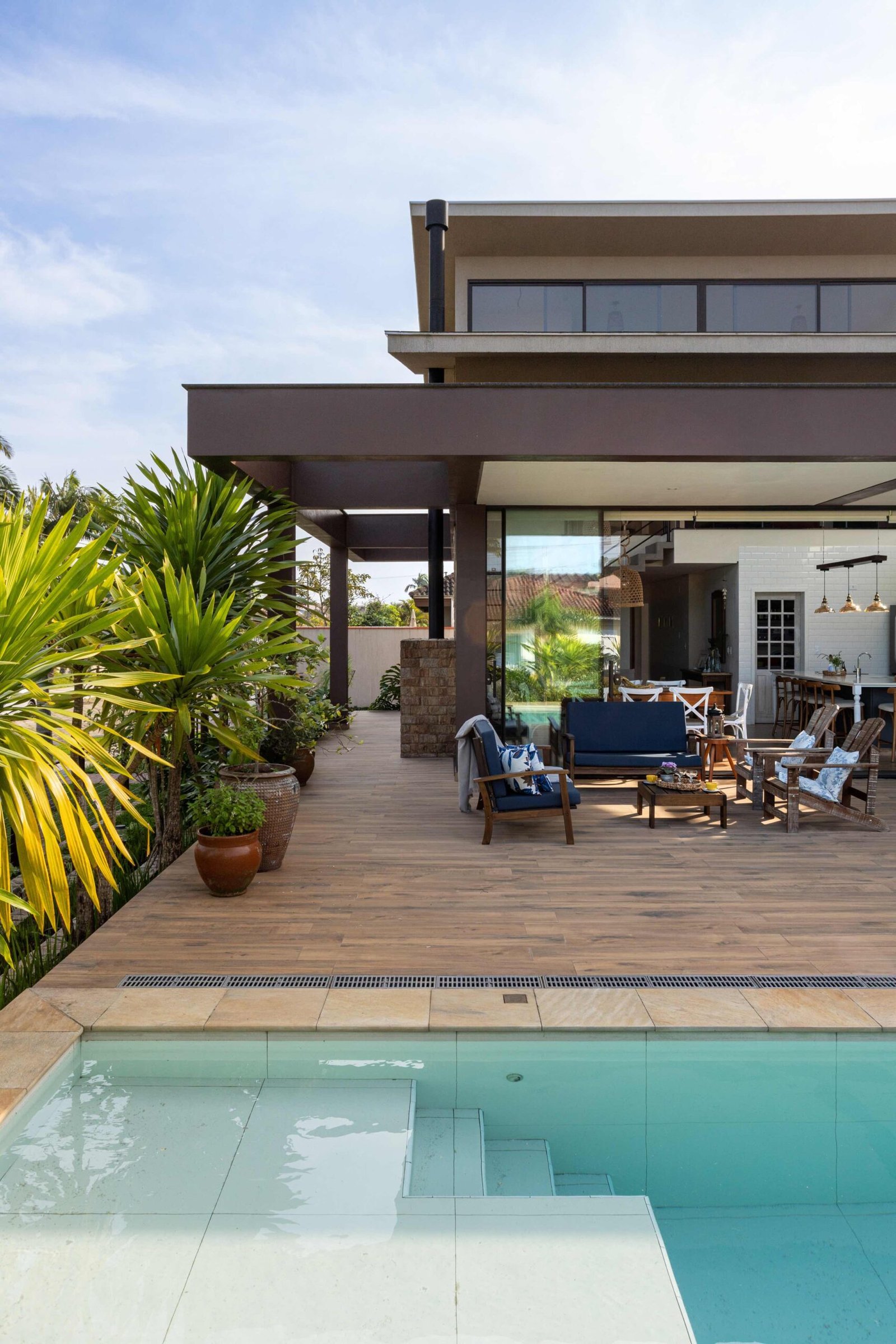 No Litoral do Paraná, projetamos uma casa de praia para um casal e seus três filhos, que desejavam um refúgio para momentos em família nos fins de semana e, no futuro, um lar para a aposentadoria. Com 226m² de área construída em um terreno de 450m², a casa foi pensada para ser fresca e confortável, aproveitando ao máximo as condições naturais do local. Elevada 1 metro do chão para evitar a umidade comum no litoral, a casa ganha privacidade e permite que a piscina, posicionada na esquina, receba a melhor insolação. A ventilação natural é abundante, com o telhado inclinado e o forro que favorecem a circulação de ar, expulsando o calor através da janela superior, criando um efeito chaminé. Com 6 quartos, sendo 2 suítes, a casa integra os ambientes de forma fluida, com grandes portas de vidro que conectam a varanda e o mezanino. O estilo, inspirado nas viagens da família e na Provence, traz elementos de pedra natural e um paisagismo encantador, criando um ambiente acolhedor e sofisticado sem exageros. A cozinha, um dos destaques, reflete a personalidade dos moradores, trazendo um toque marcante à decoração. A casa é, acima de tudo, um lugar para viver intensamente a convivência familiar, em harmonia com a natureza e com o clima local.